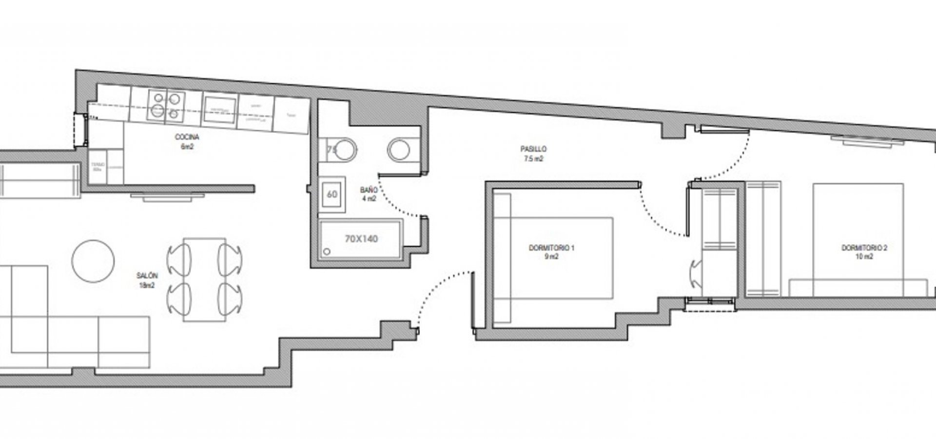 The property has a built area of 77 m², functionally distributed into 2 bedrooms, 1 full bathroom, a bright living-dining room, hallway, and a fully furnished and equipped kitchen with appliances.