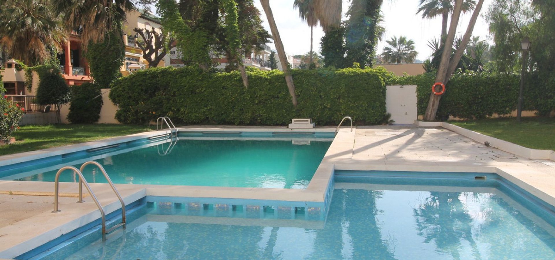 Recinto cerrado con piscina comunitaria, jardines y zona infantil
