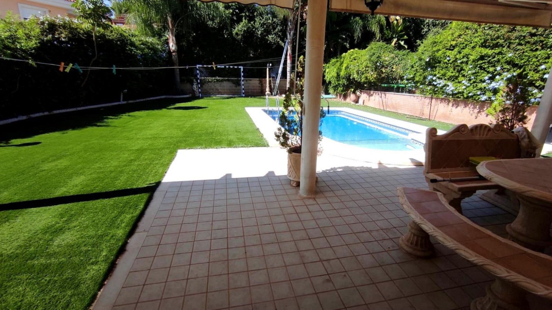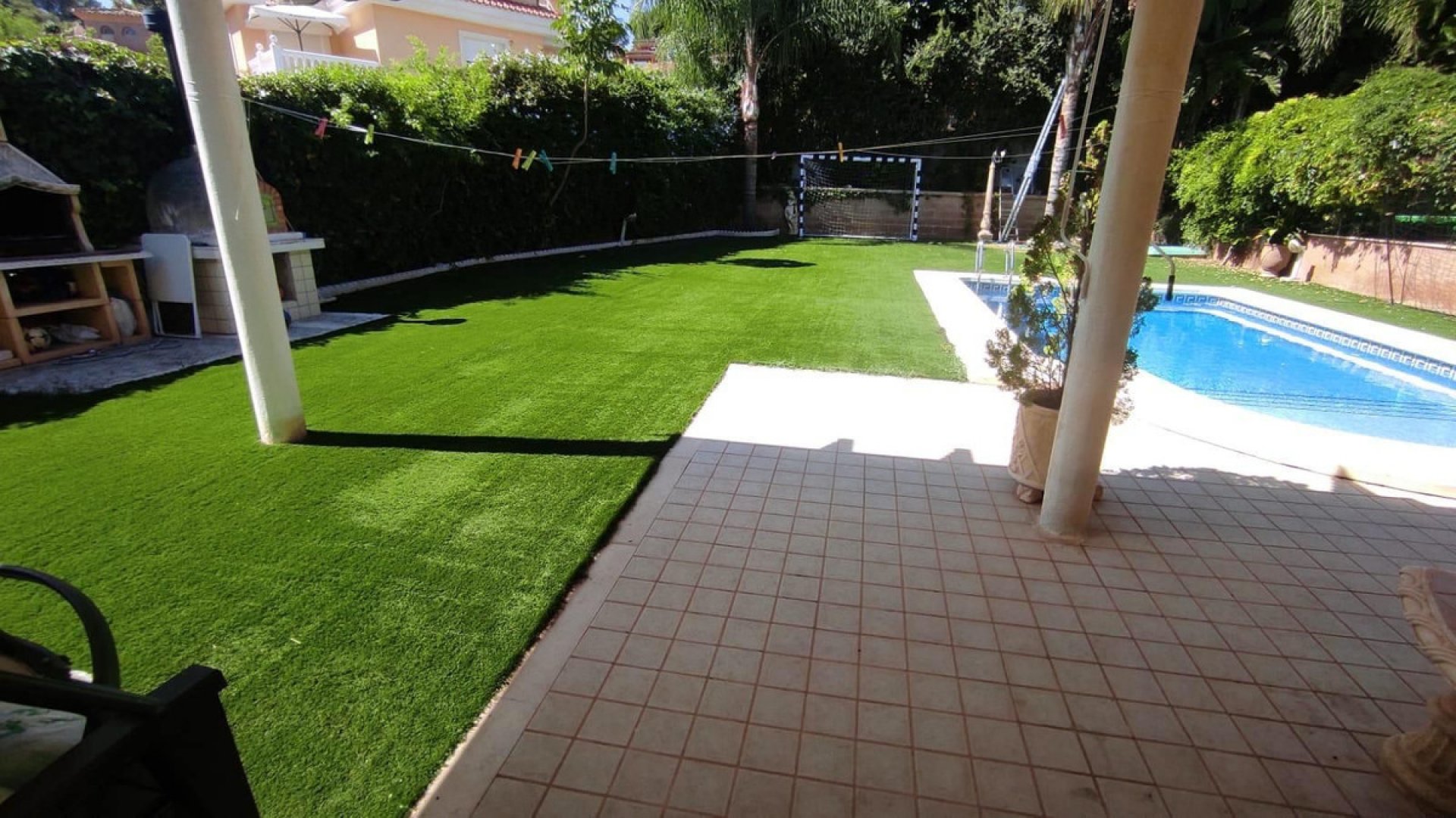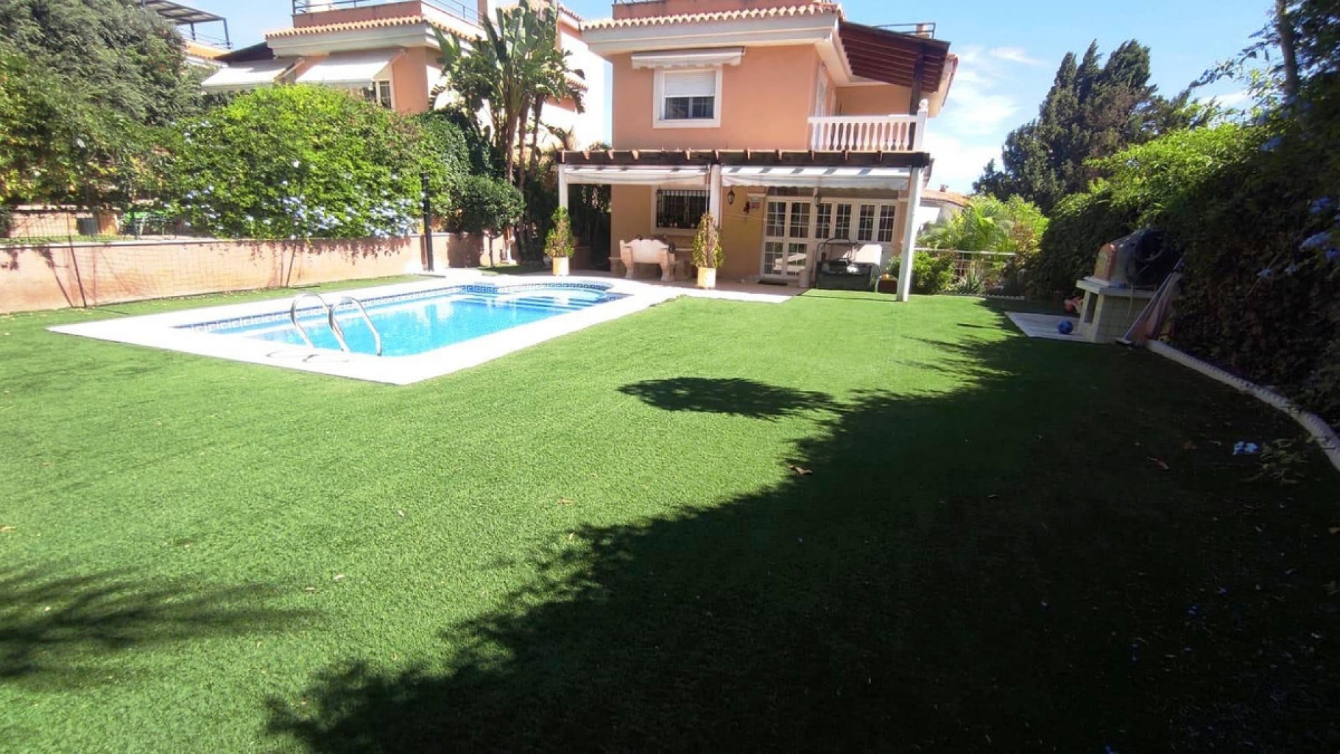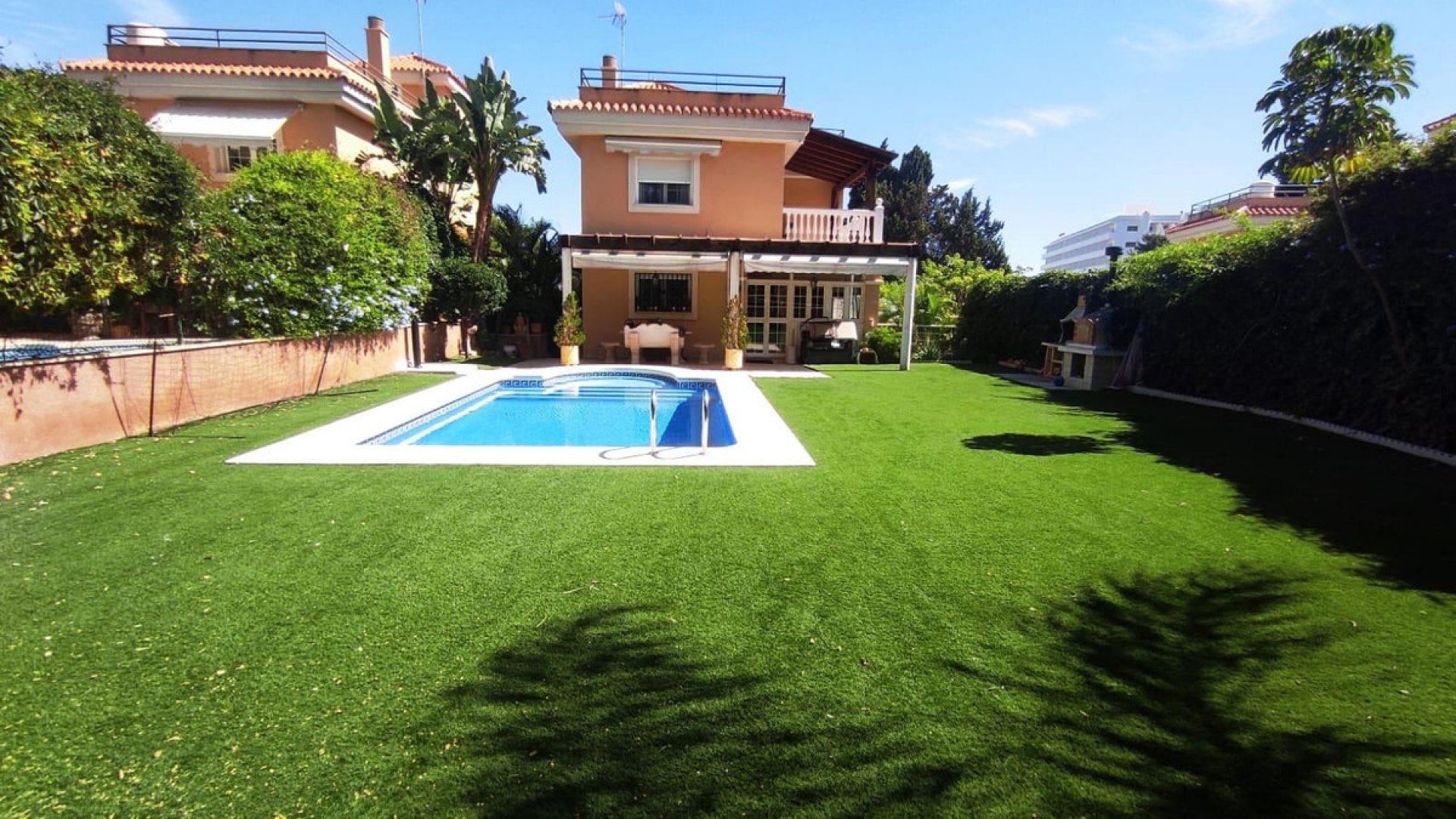 El exterior de la villa no se queda atrás: un jardín privado con piscina te invita a disfrutar del clima mediterráneo, mientras que el garaje privado y el trastero ofrecen espacio adicional para tus necesidades. Su orientación garantiza luz natural durante todo el día. Construida en 2008 y en excelente estado de conservación, esta propiedad también cuenta con armarios empotrados, chimenea, balcón y terraza.