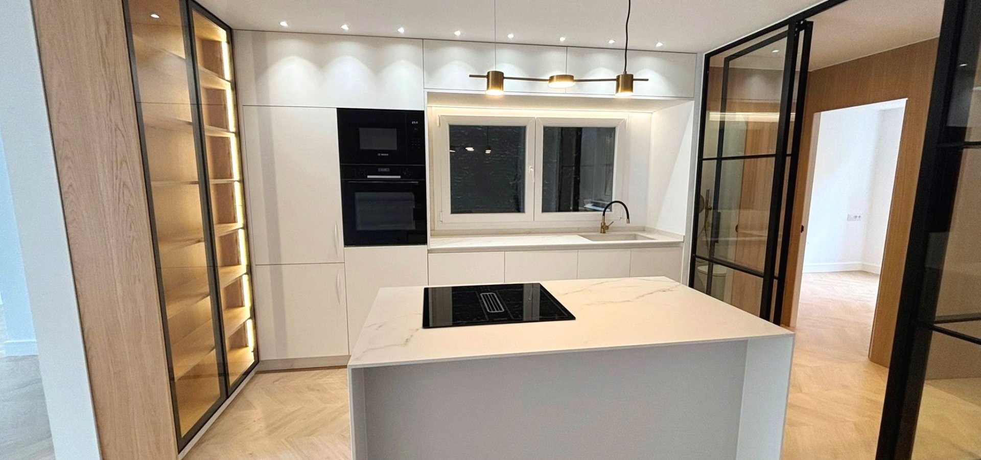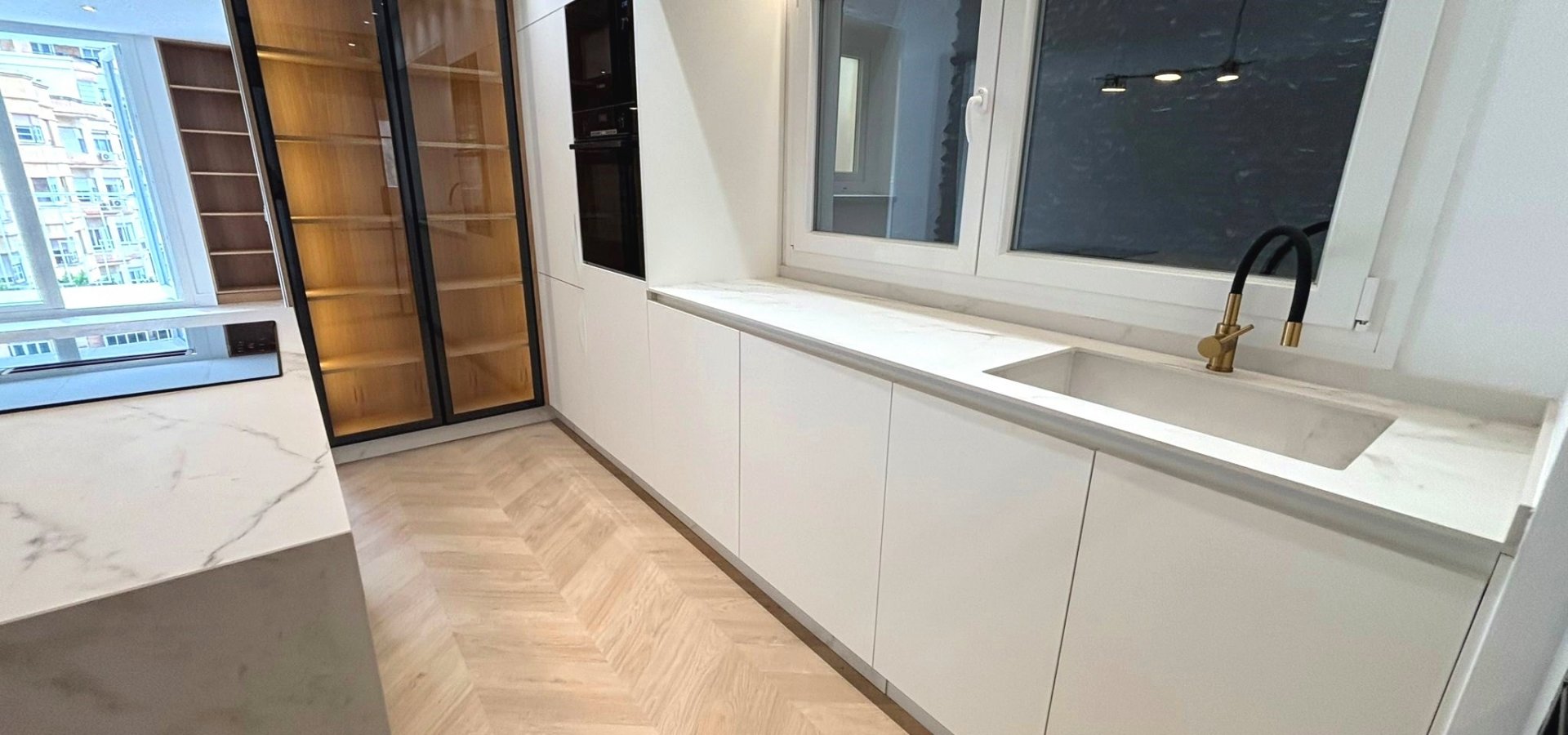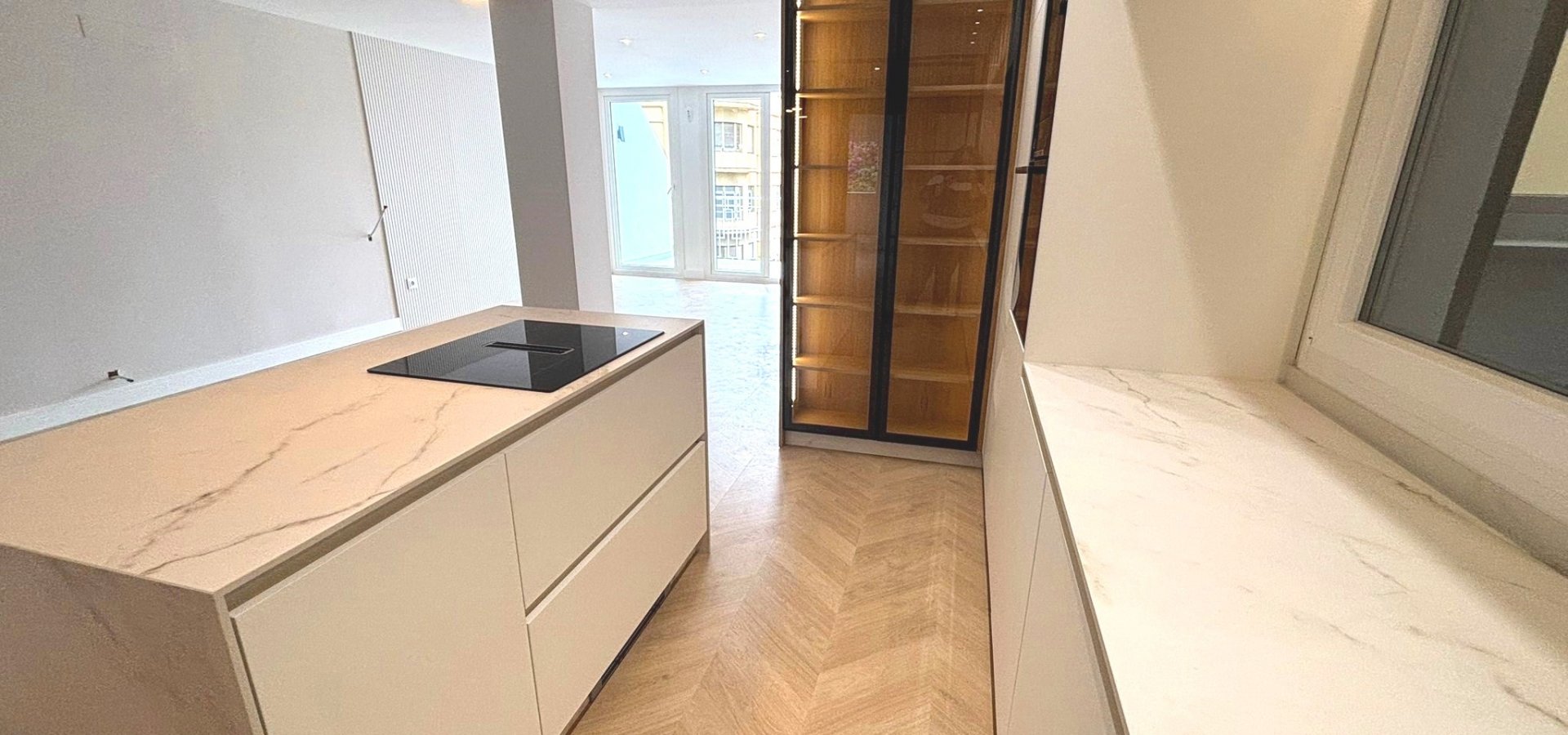A fully furnished and equipped kitchen with high-end porcelain countertops featuring a veined finish.