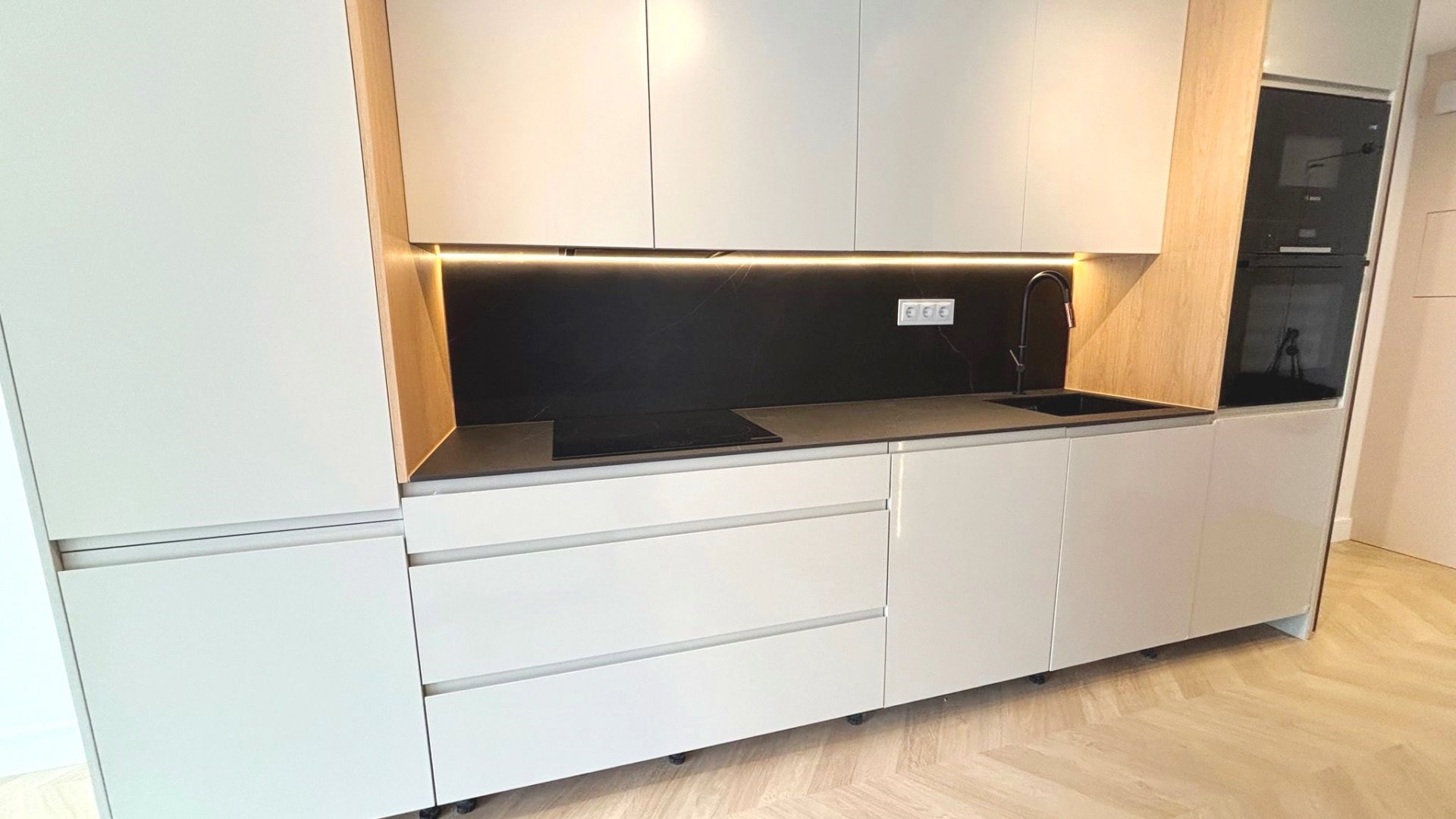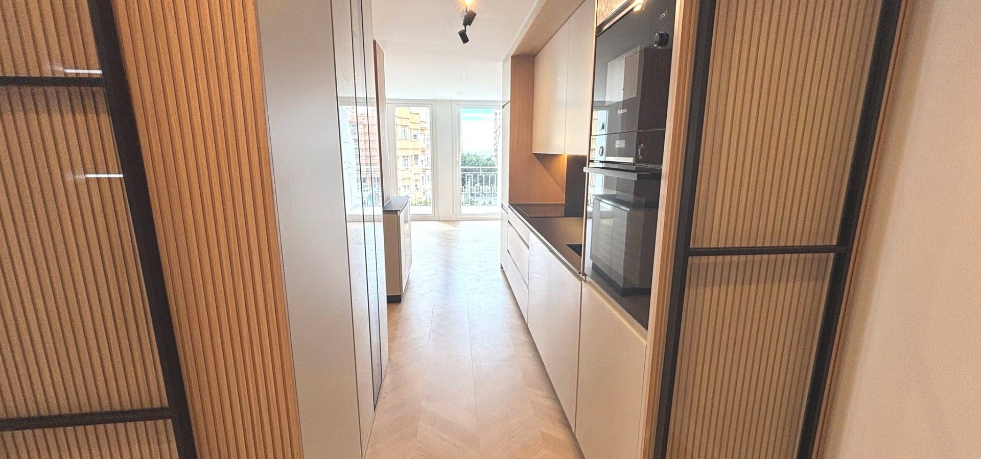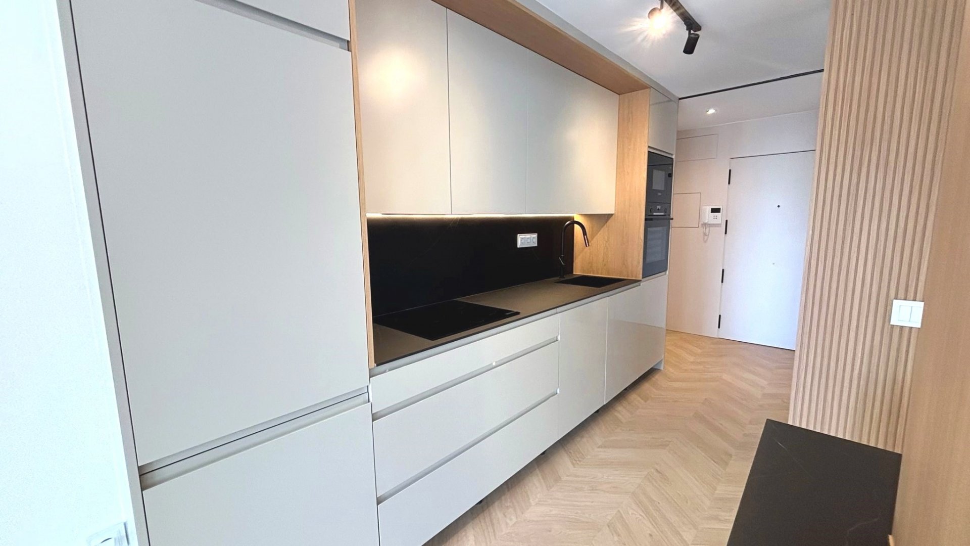 Cocina amueblada y equipada con electrodomésticos, con encimera porcelánica de alta gama con acabado beteado.