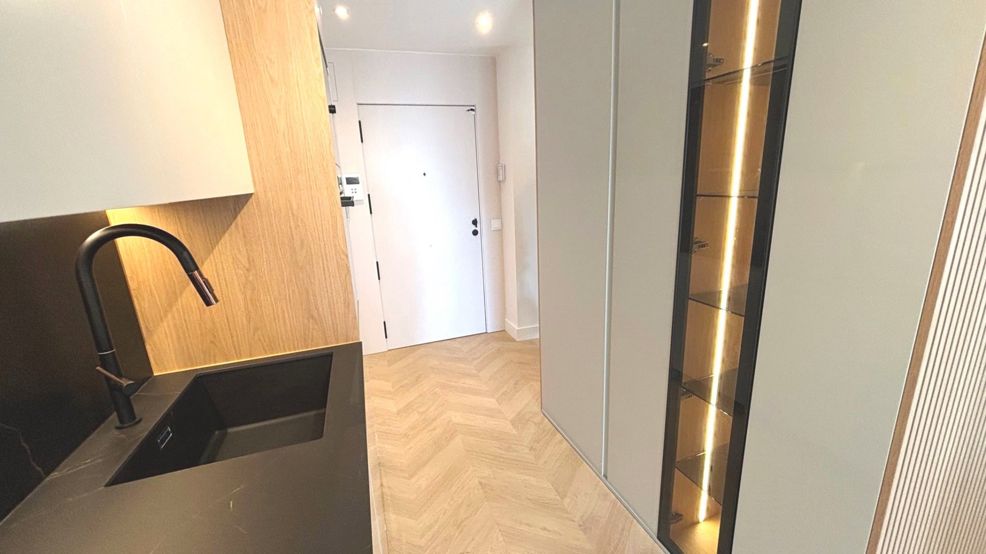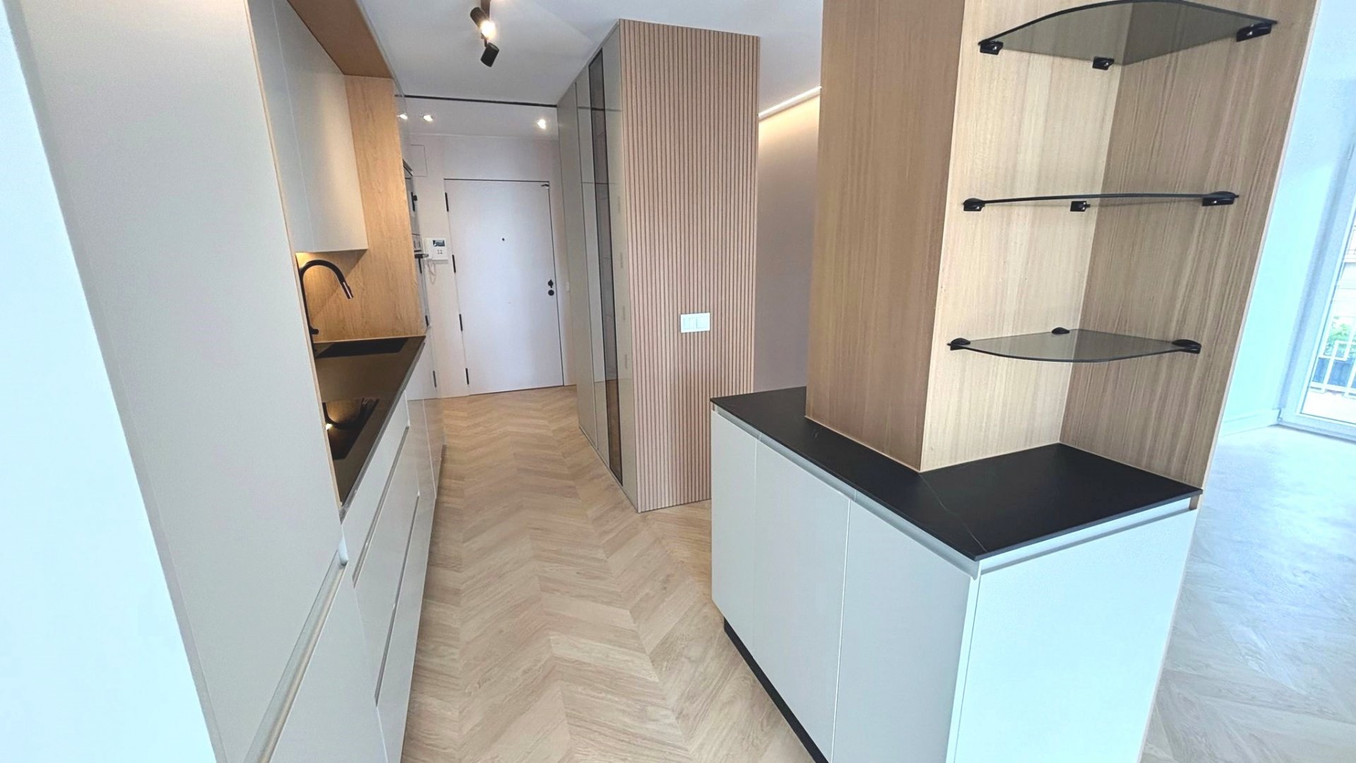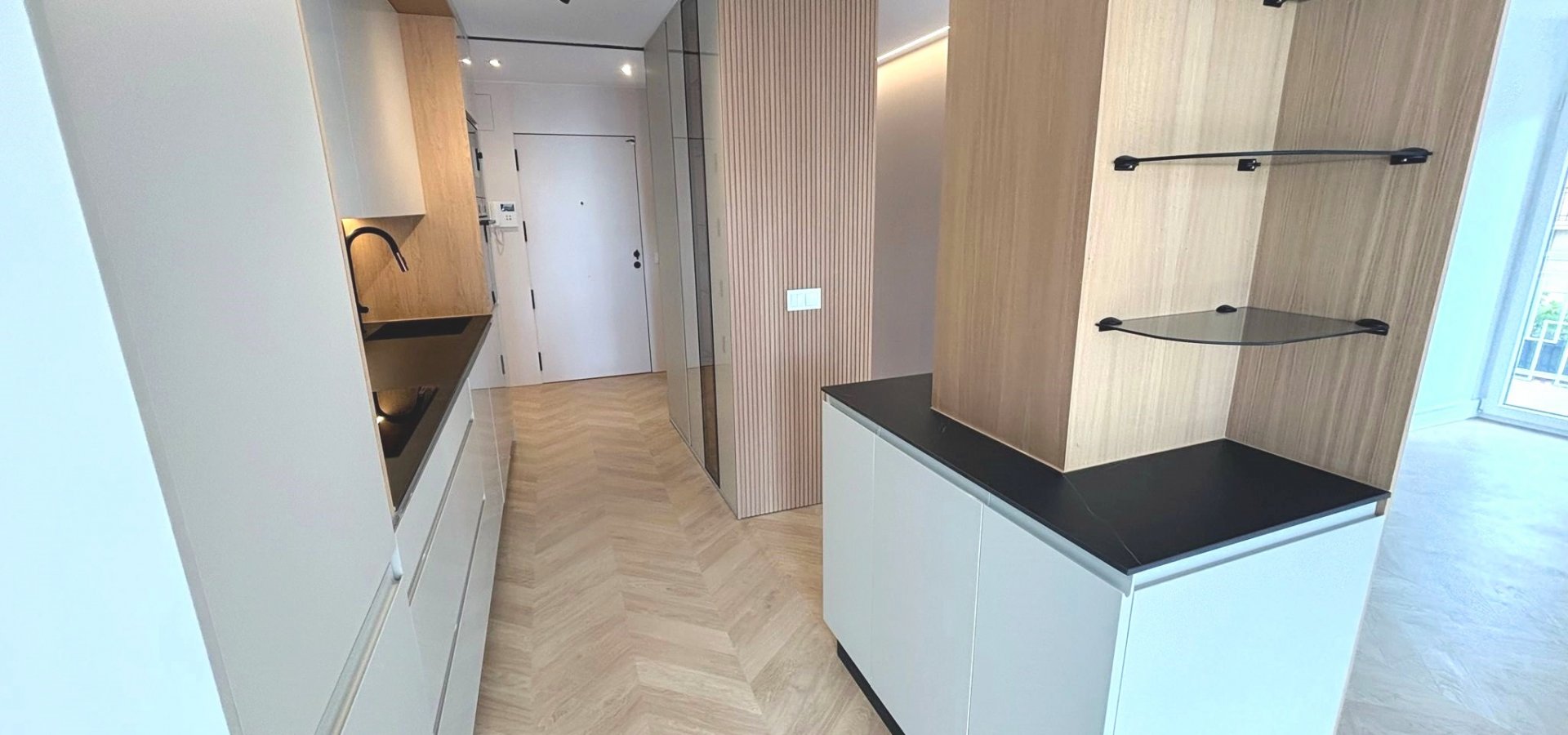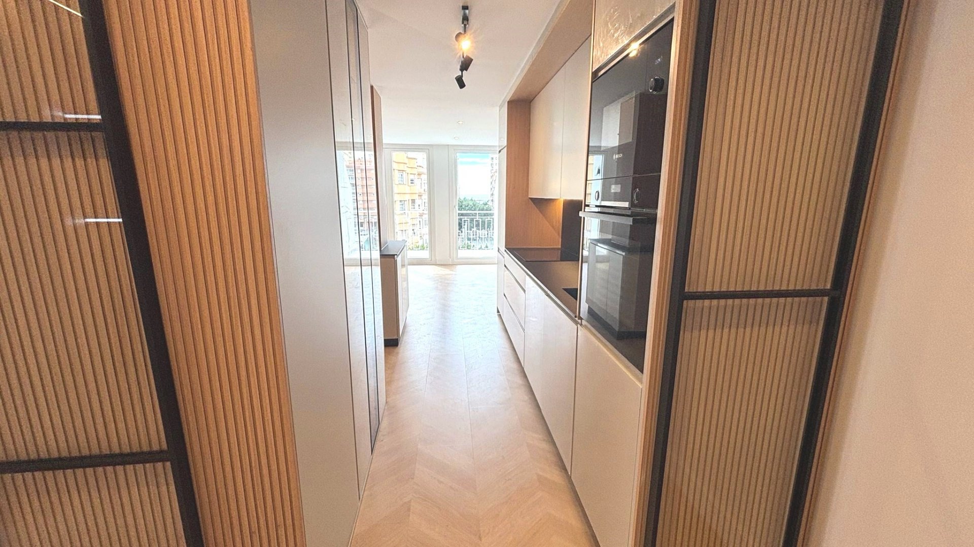 Cocina amueblada y equipada con electrodomésticos, con encimera porcelánica de alta gama con acabado beteado.